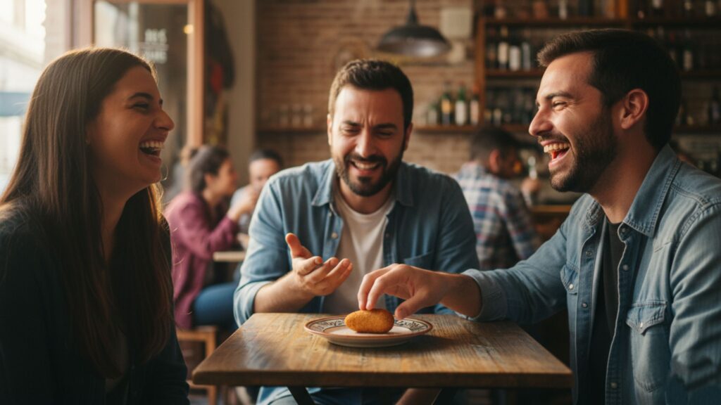 Y claro, cuando intentas repartir algo que no se puede dividir, la armonía se rompe. Lo que era una tapita inocente se convierte en un dilema moral: ¿quién se come la última croqueta? El valiente, el glotón o el que mira para otro lado fingiendo que ya está lleno.