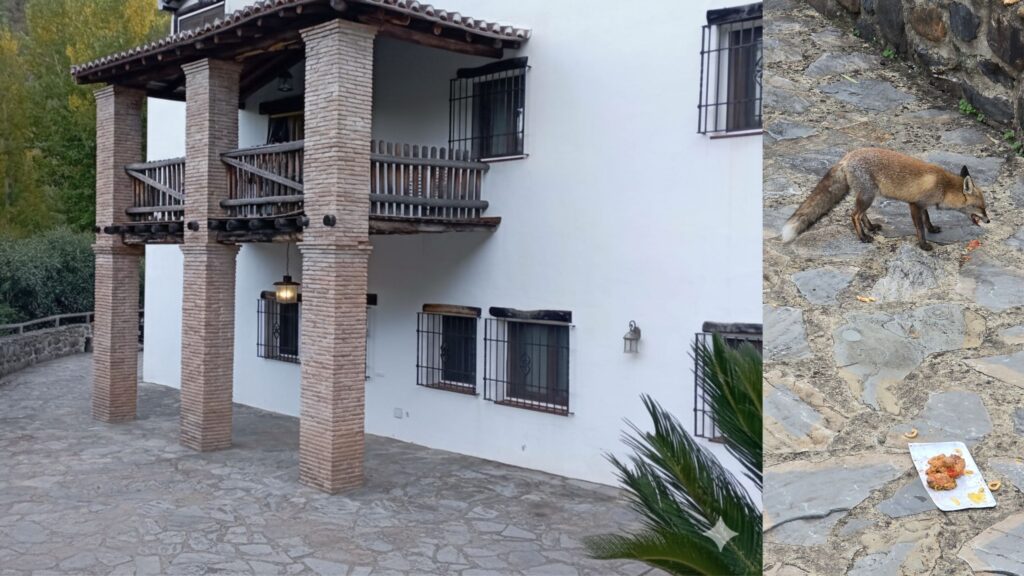 Antes de que la noche se nos echara encima, volvimos a El Manantial para otra velada entre amigos, risas y juegos. Y allí nos esperaban los verdaderos anfitriones: dos zorros.Uno más grande, que se dejaba ver por la noche, y otro pequeño que merodeaba al amanecer. Los dueños ya nos habían advertido de no dejar basura fuera, así que les preparamos un pequeño “banquete controlado” en un rincón del patio. Vinieron, comieron y posaron para las cámaras. Una visita salvaje con mucho arte. Y si llegan a saber lo que costó la carne mechada, hasta nos dejan propina.